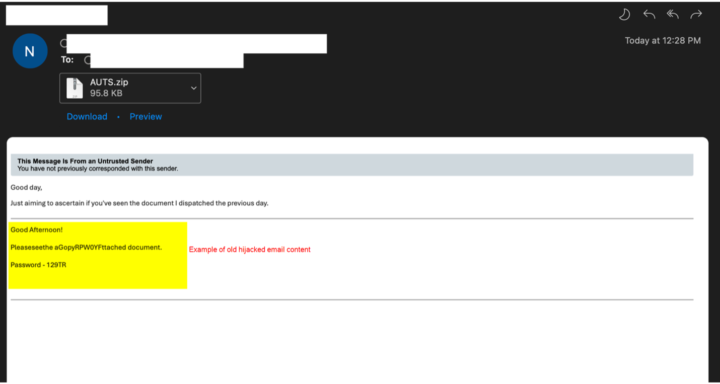 The latest campaign starts with phishing emails that use a technique called thread hijacking in which the emails seem like replies to the target’s previous conversations. These emails contain unique ZIP archives that have HTML files, using META refresh HTML tags to gain an automatic connection to a text file present on an external Server Message Block (SMB) server.