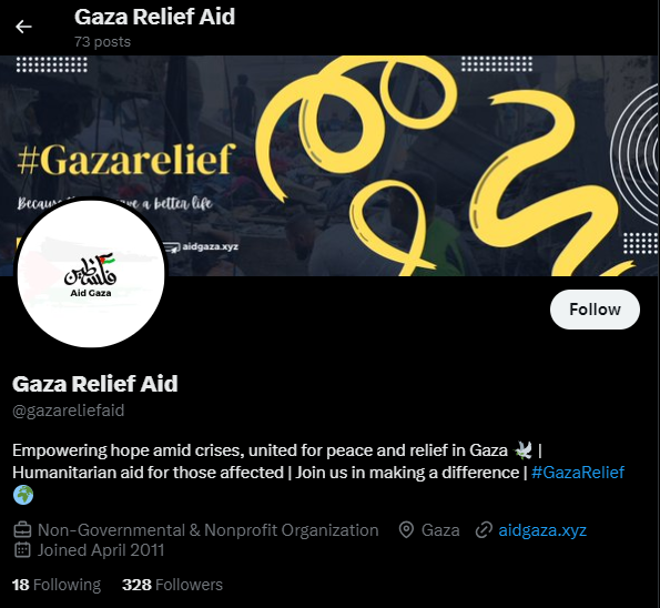 One example of these scam accounts is “Gaza Relief Aid” which uses the domain name ‘aidgaza.xyz’ and is not associated with any legitimate charitable organizations despite claiming to be “An Islamic Relief Initiative”. However, the evil twin website has been lifted from the Islamic Relief’s official website