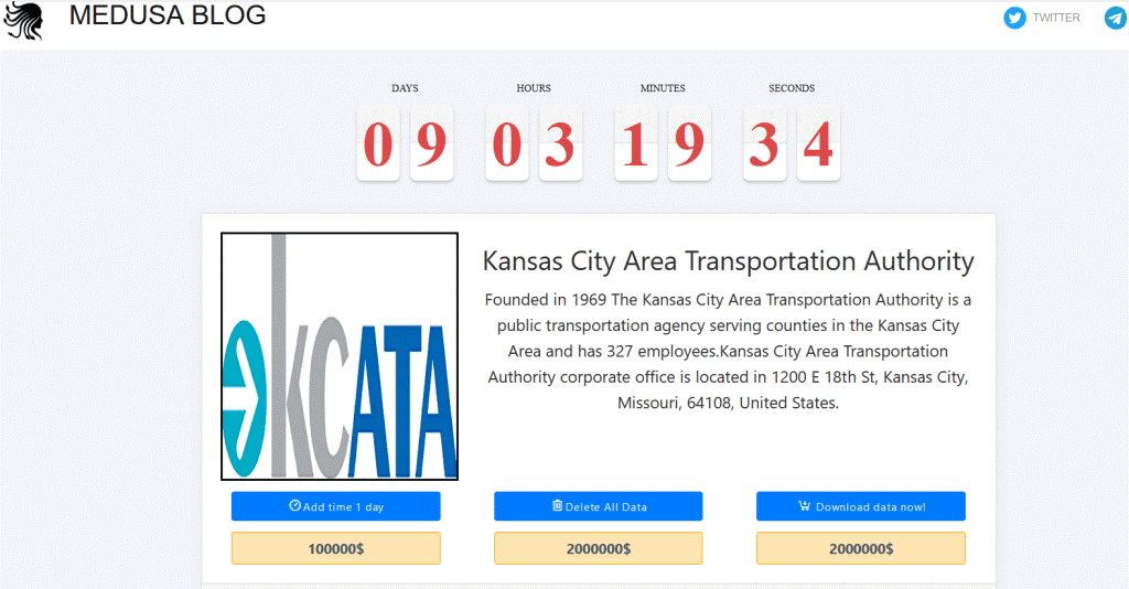 The Kansas City Area Transportation Authority (KCATA) was targeted with a ransomware attack on January 23, 2023. The Medusa ransomware gang recently claimed responsibility for the attack and added the company to its leak site on the dark web.