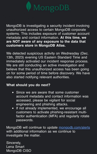 The company advises that all customers enable multi-factor authentication (MFA) on their accounts, change passwords regularly, and be on the lookout for potential spear-phishing and social engineering attacks since the customer metadata was leaked. MongoDB will continue to post updates regarding the breach as the investigation continues.
