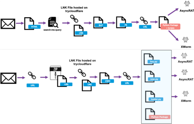 This method has been observed in attack chains that deliver various malware families, including AsyncRAT, GuLoader, PureLogs Stealer, Remcos RAT, Venom RAT, and XWorm. The initial access is typically through a phishing email containing a ZIP archive, which leads the recipient to a Windows shortcut file hosted on a TryCloudflare-proxied WebDAV server. Once the shortcut file is executed, it triggers batch scripts that retrieve and execute additional Python payloads while displaying a decoy PDF document to maintain the ruse.