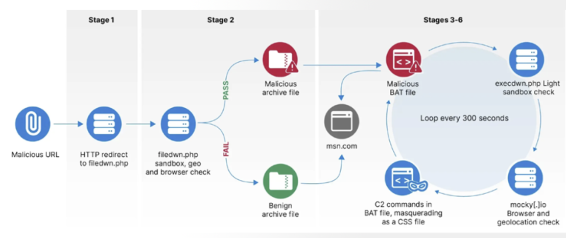 According to researchers, the deployment of HeadLace occurred in three distinct phases. The first phase involved a complex seven-stage infrastructure chain to deliver a malicious Windows BAT script capable of downloading and executing further shell commands with checks for sandbox environments and geofencing to target specific networks. The second phase which began on September 28, 2023, marked a shift to using GitHub for redirection infrastructure, and the third phase, starting October 17, 2023, moved to PHP scripts hosted on InfinityFree. The last recorded activity in this phase was in December 2023 after which APT28 transitioned to using webhook[.]site and mocky[.]io for hosting their malicious infrastructure.