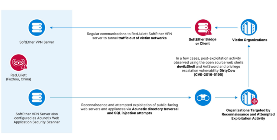 Researchers have identified up to 24 victim organizations communicating with RedJuliett's infrastructure highlighting its broad scope. Among the notable tools in RedJuliett's arsenal is the use of SoftEther, an open-source software for tunneling malicious traffic which the group deploys to maintain persistence once inside victim networks.