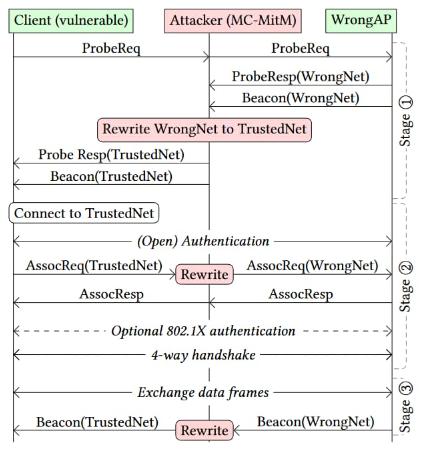 According to the researchers, the attack is based on the fact that security measures are only necessary when a device chooses to join a specific network, and the Wi-Fi standard does not need the network name (SSID or the service set identifier) to be authenticated at all times. This behavior has the overall effect of allowing an attacker to stage an adversary-in-the-middle (AitM) attack and trick a client into connecting to an untrusted Wi-Fi network instead of the one it was supposed to.