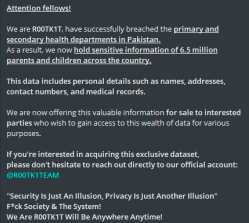 R00TK1T has perpetrated a sophisticated cyberattack against the primary and secondary health departments in Pakistan, exploiting vulnerabilities in their systems to gain unauthorized access. As a consequence of this breach, the hackers have obtained sensitive information about approximately 6.5 million parents and children across the country. The compromised data encompasses: