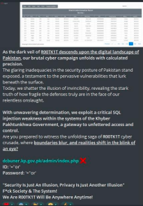 After this announcement, R00TK1T launched a targeted cyber campaign in Pakistan, exploiting vulnerabilities within the Khyber Pakhtunkhwa Government's systems using a critical SQL injection weakness. This exposes the country's security inadequacies, highlighting the fragility of its defenses against sophisticated cyber threats.