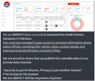 On 2nd May 2024, R00TK1T claimed to execute a sophisticated attack on the database infrastructure of Sindh Police, compromising its security defenses. The breach enabled unauthorized access to a wealth of confidential information related to police officers. The compromised data includes: