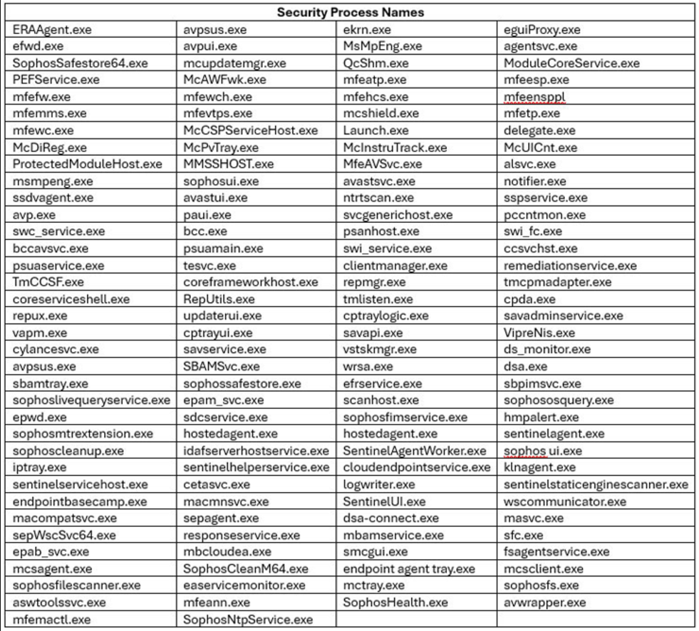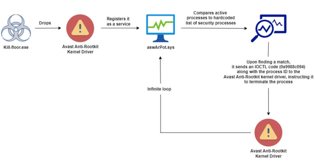 The attack starts with an executable file, kill-floor.exe, which drops and registers the Avast driver as a service using Service Control (sc.exe). Once operational, the driver provides the malware with deep system access, enabling it to terminate up to 142 processes related to security software. This is achieved by capturing snapshots of active processes and cross-referencing them with a preconfigured list of target processes. By leveraging the Avast driver’s kernel-mode capabilities, the malware bypasses tamper-protection mechanisms rendering conventional security solutions ineffective.
