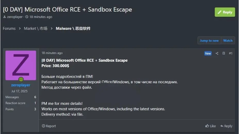 A threat actor known as Zeroplayer has reportedly advertised a dangerous zero-day remote code execution (RCE) exploit paired with a sandbox escape affecting Microsoft Office and Windows systems. Listed for $30,000 on a prominent Russian hacking forum, the exploit is said to work on most modern Office file formats and even on fully patched Windows installations. This claim has raised major concern in the cybersecurity community, as a sandbox escape significantly amplifies the impact of any Office-based attack.